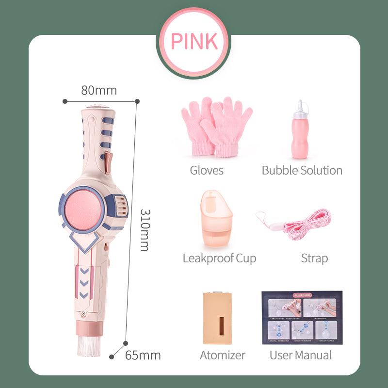 Package includes: 1x Bubble Machine 1 bag x bubble water 1 pair of x gloves 1 *Leak-proof cup 1 *Sling 1 *Atomizer